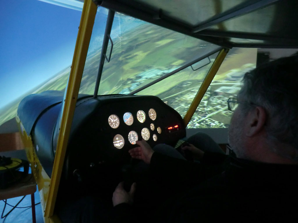 Pour les déplacements à l’extérieur nous avons la partie avant d’un ULM dans laquelle est intégré Flight simulateur et 3 vidéo projecteurs qui assurent le rendu visuel.